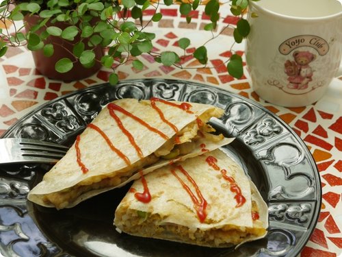 冰箱裡剩的半碗炒飯加上一顆雞蛋拌勻煎成炒飯蛋餅中間夾上幾片起士